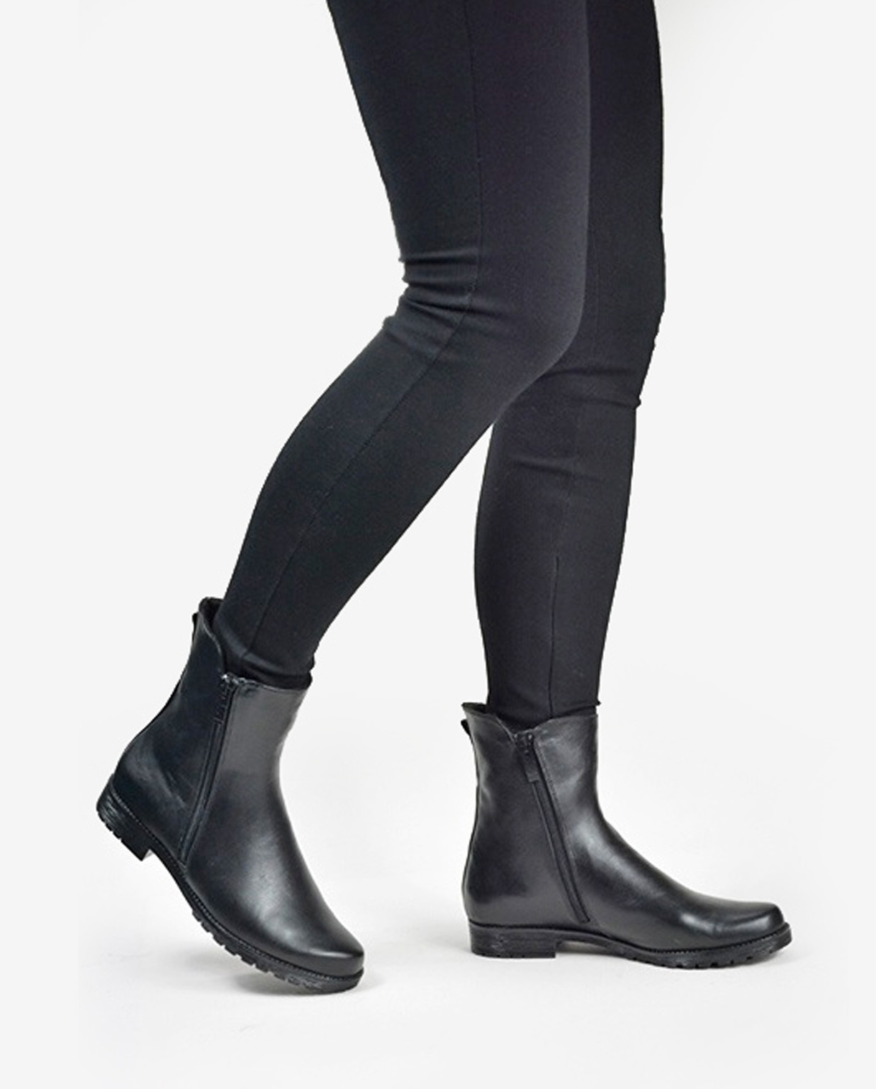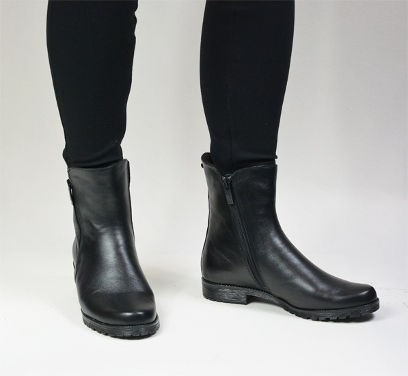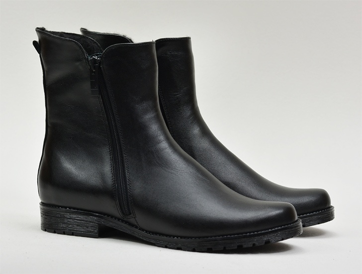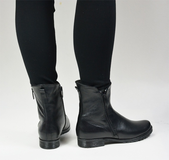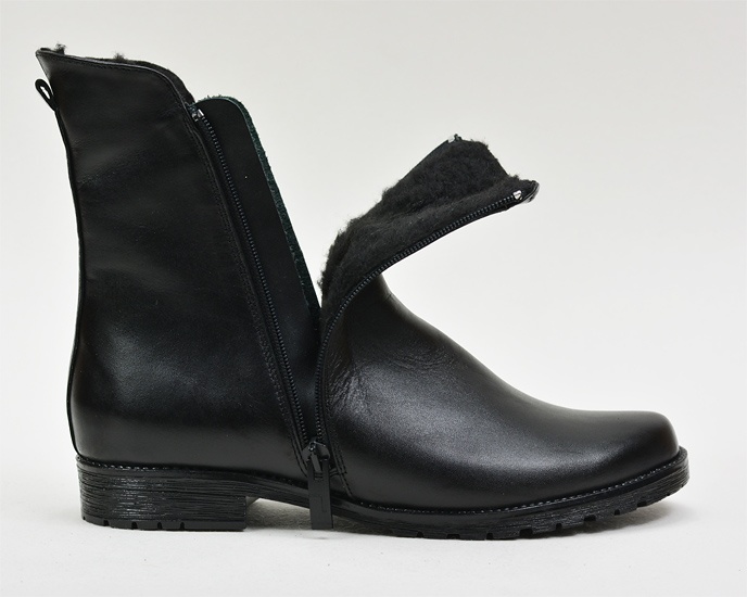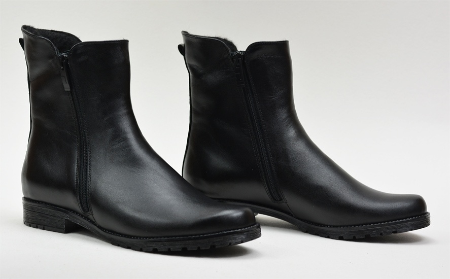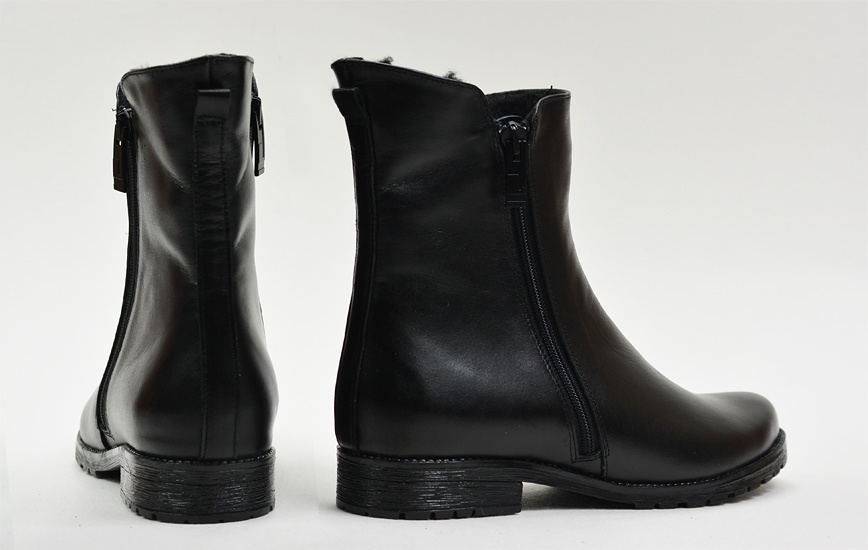 Czarne, ocieplane botki wykonane ze skóry licowej, zapinane na suwak z obu stron.