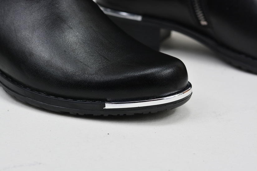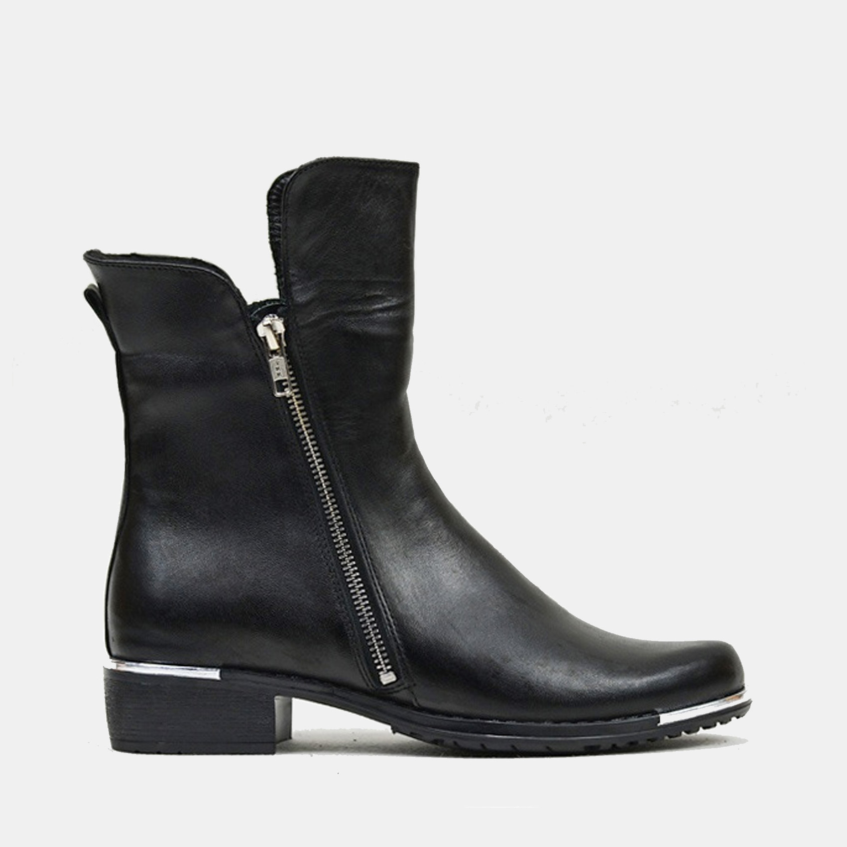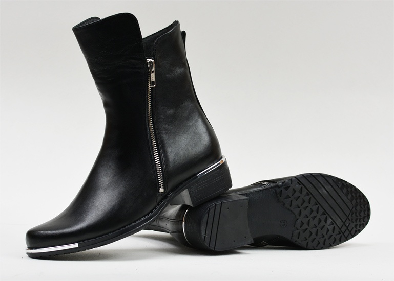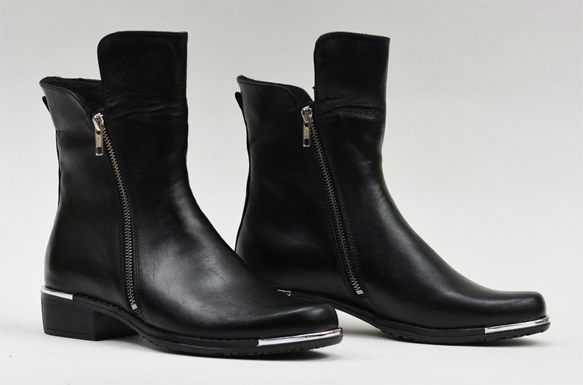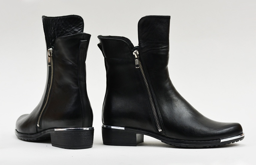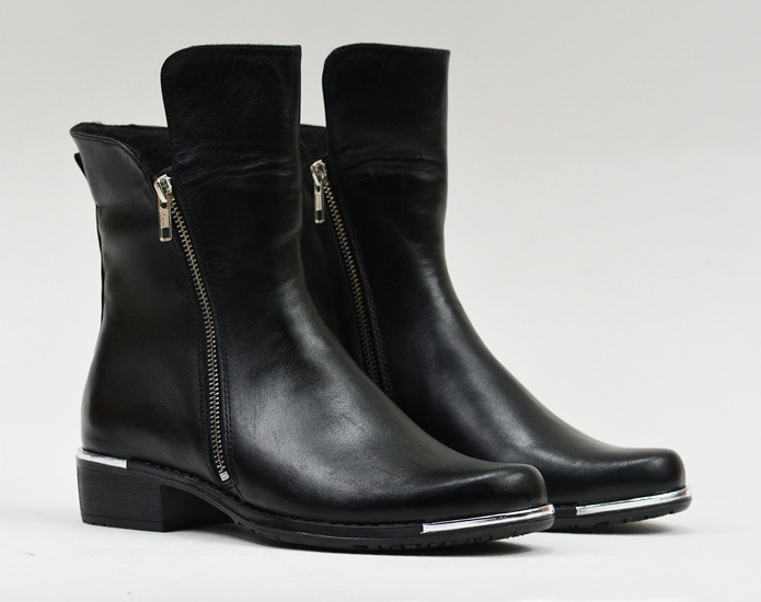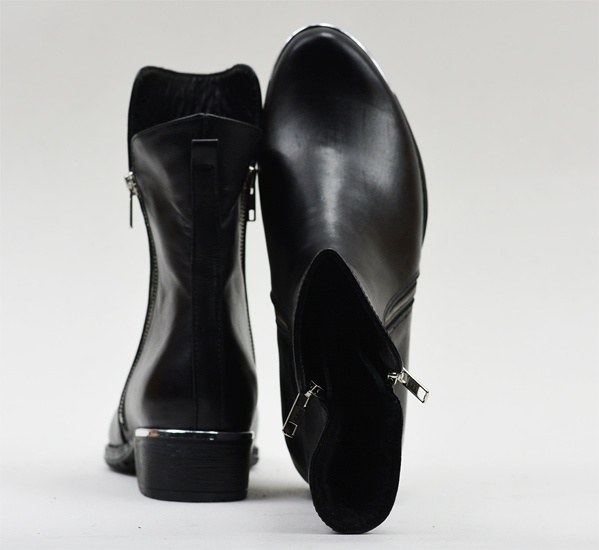 Czarne botki wykonane ze skóry licowej zapinane na suwak od obu stron.